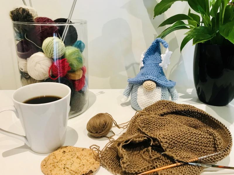 Vi hygger os med vores strik/hæklerier, får inspiration af de andres værker og hjælper selvfølgelig hinanden.
